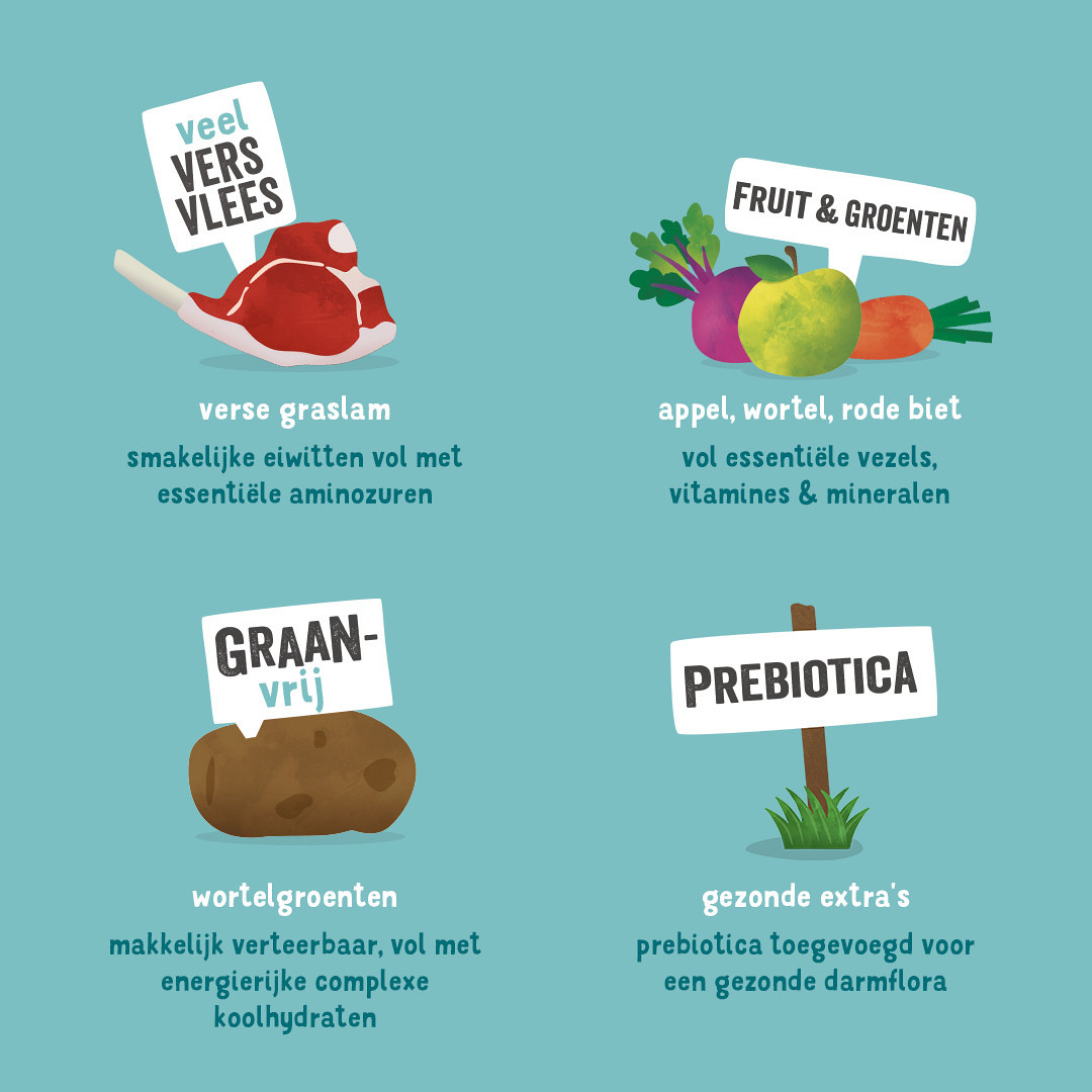 Samenstelling: vers lam 41%, aardappelen, erwten, erwteneiwit, lijnzaad, lamssaus, zonnebloemolie, mineralen, aardappeleiwit, visolie, mannan-oligosachariden (MOS), fructo-oligosachariden (FOS), wortels 0,04%, appels 0,04%, peer 0,04%, broccoli 0,04%, banaan 0,04%, boerenkool 0,04%, spinazie 0,04%, rode bieten 0,04%, bosbessen 0,04%, goudsbloemblaadjes, brandnetel, braambesblaadjes, venkel, karwij, kamille, melisse.