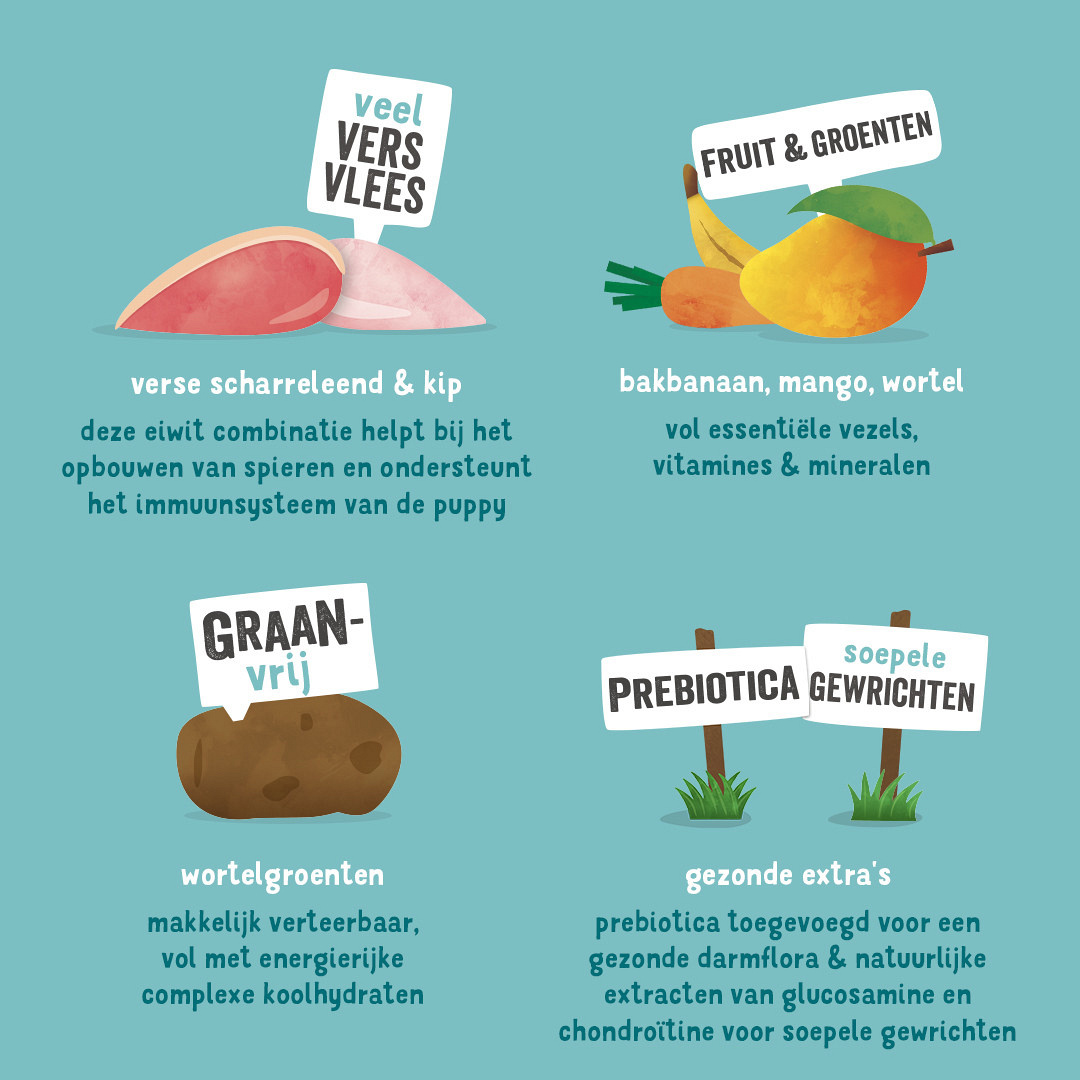 Graanvrij hondenvoer met verse scharreleend en scharrelkip voor puppy's.