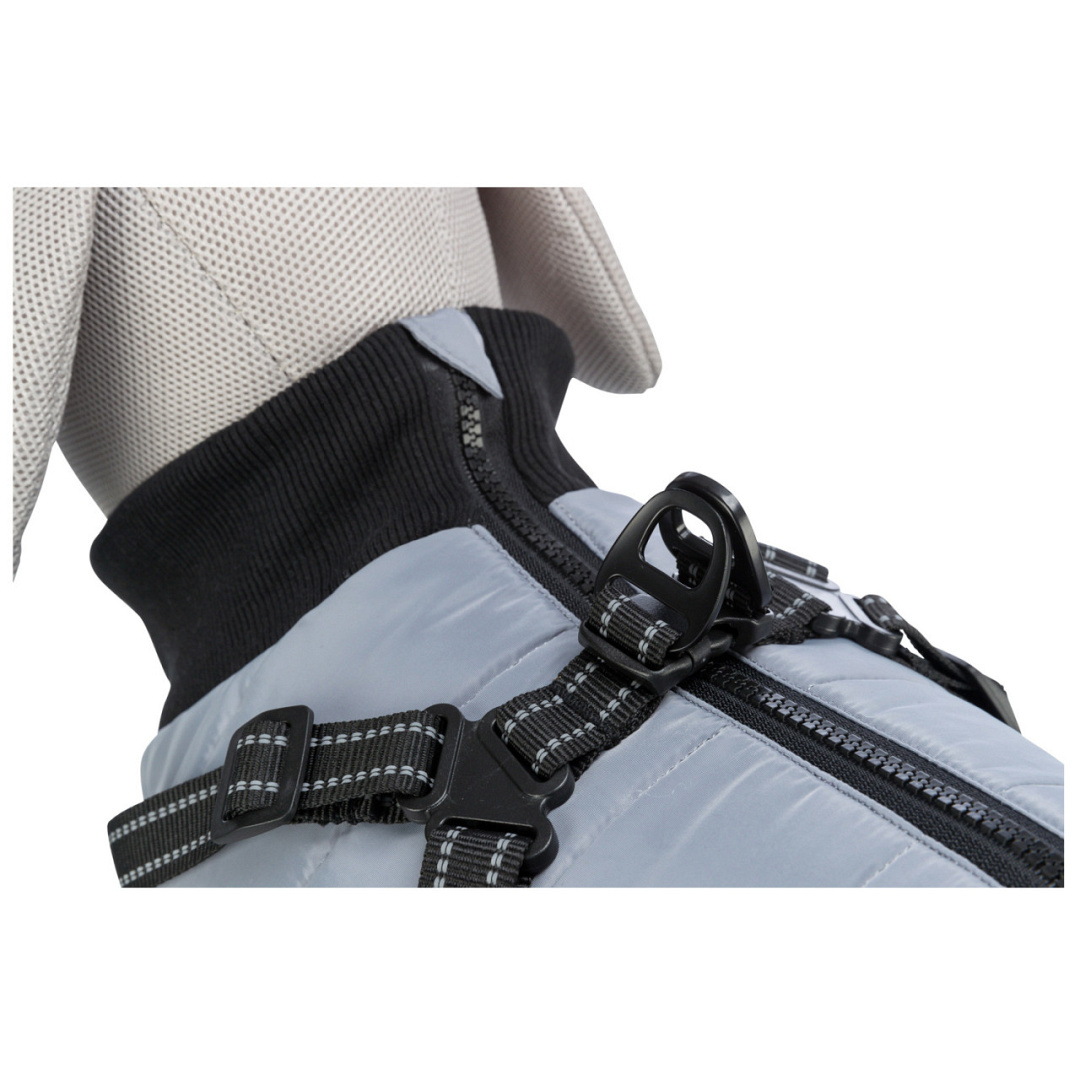 Comfortabele hondenjas met geïntegreerd tuig, fleecvoering en reflecterende elementen.