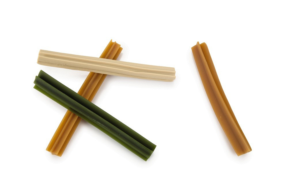 Plantaardige snack helpt de tanden schoon te houden. Verkrijgbaar in 3 varianten. Variant niet vrij te kiezen.