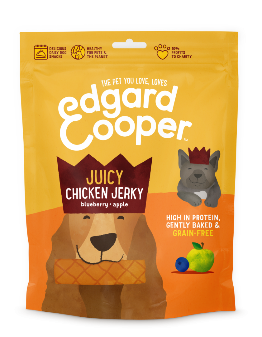 Deze graanvrije Edgard & Cooper jerky kip zit vol goede dingen. De beste stukjes kip worden traag gegaard om die verrukkelijk smaak optimaal te bewaren. Daar zit wat koolzaadolie bij om het vlees lekker sappig te houden plus blauwe bessen en appel! Deze eiwitrijke, graanvrije snacks zijn perfect voor elke hond.