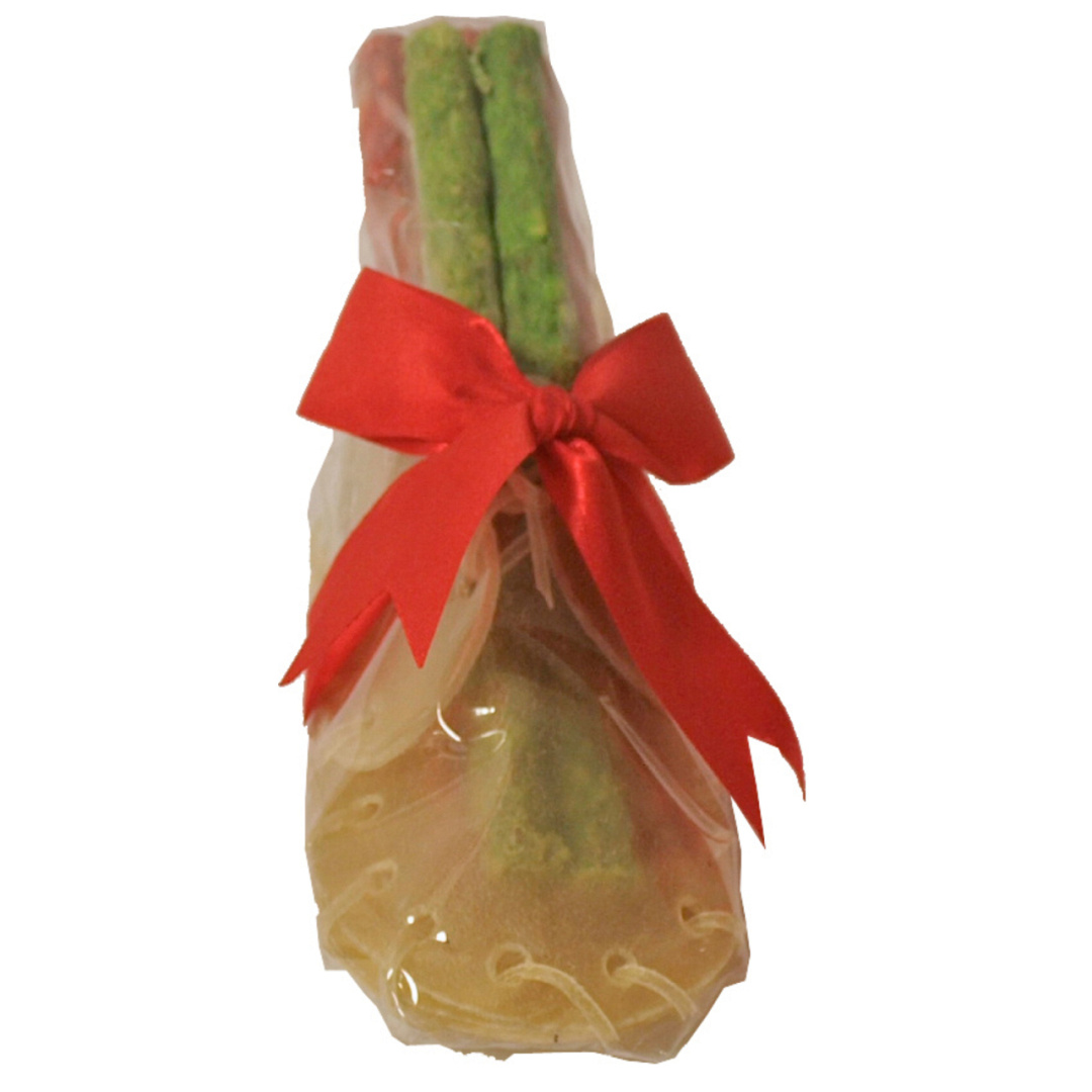Feestelijke kauwschoen van buffelhuid, gevuld met munchy kauwstaafjes.
