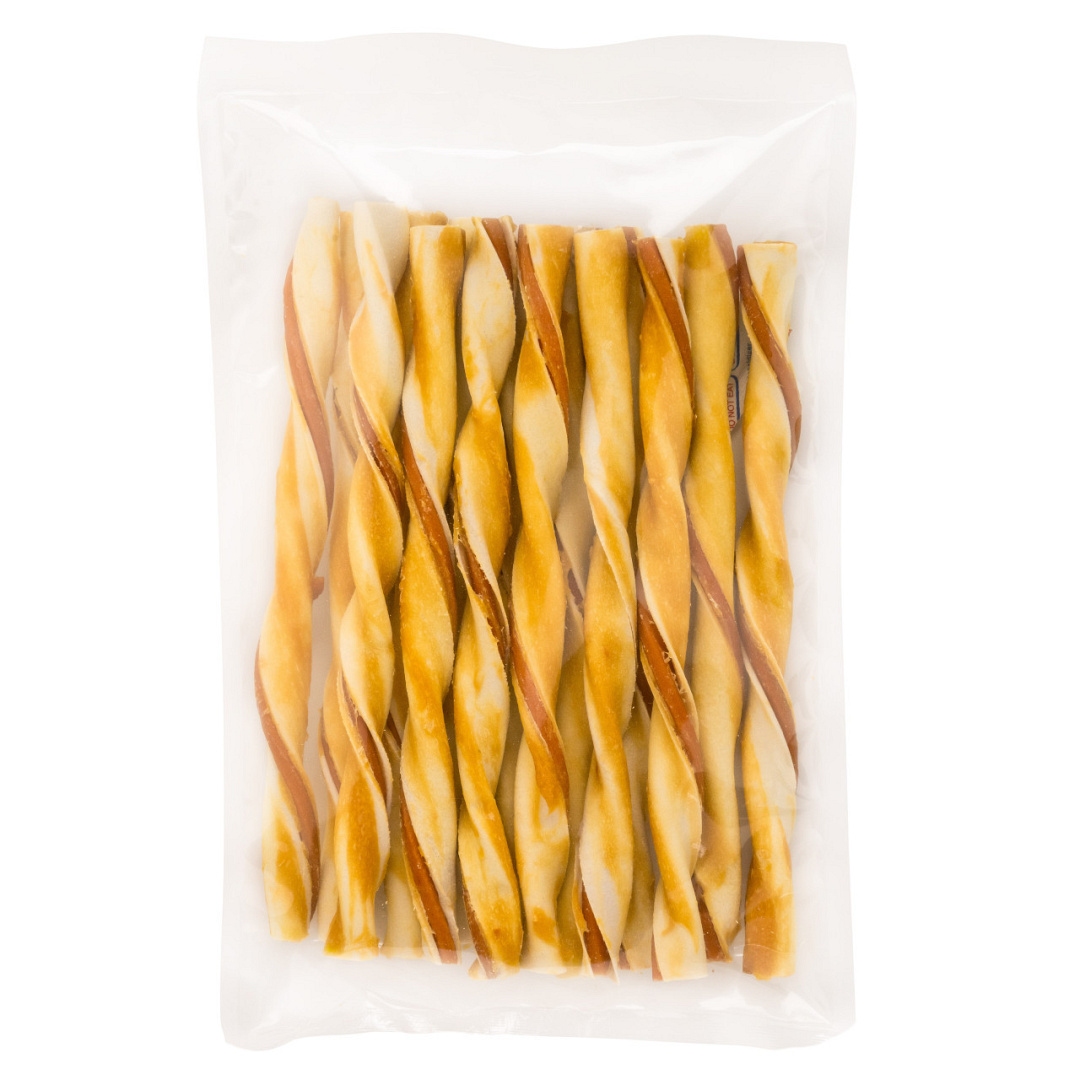 Natuurlijke hondensnack van runderhuid met ingevouwen kippasta. Glutenvrij.