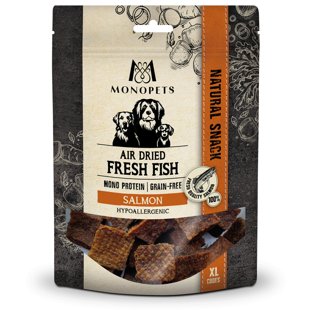 Monopets air dried snacks Fresh Fish Salmon Cubes XL is een smaakvolle hondensnack op basis van één dierlijke eiwitbron. Deze graanvrije en hypoallergene snack van zalm is een natuurlijke traktatie en bevat zorgvuldig geselecteerde ingrediënten. Het product is geschikt voor alle levensfasen.