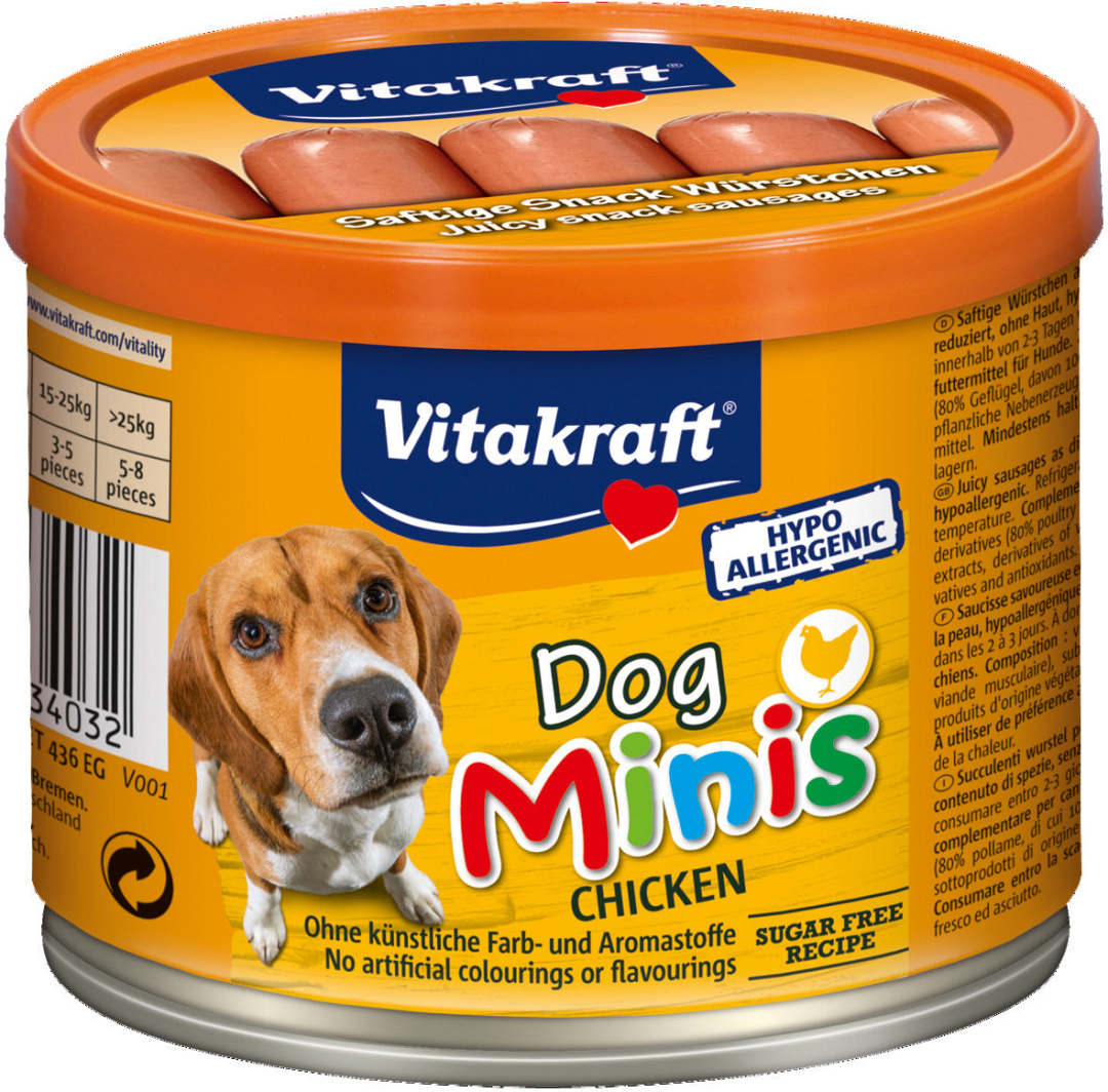 12 kleine snackworstjes in een handig blik. De worstjes zijn specifiek op de hondenmaag afgestemd.