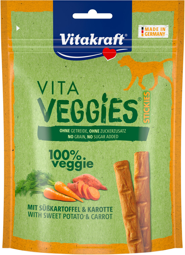 Vitakraft Vita Veggies Sticks Zoete Aardappel zijn 100% vegetarische hondensnacks. Deze traktatie brengt variatie in het snackmenu van je hond met als extra voordeel dat de belasting op het milieu substantieel lager is dan bij traditionele snacks. Deze Vita Veggies sticks zijn rijk aan gezonde groenten en leveren waardevolle caroteen uit wortel en zoete aardappel. Dit maakt de vetarme snack perfect als vegetarisch alternatief om te verwennen, belonen of gewoon voor de kleine trek tussendoor.