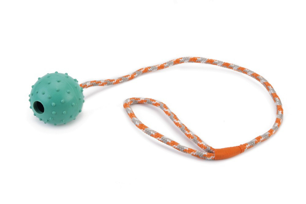 Rubberen bal met belletje en koord om hem lekker ver weg te slingeren.