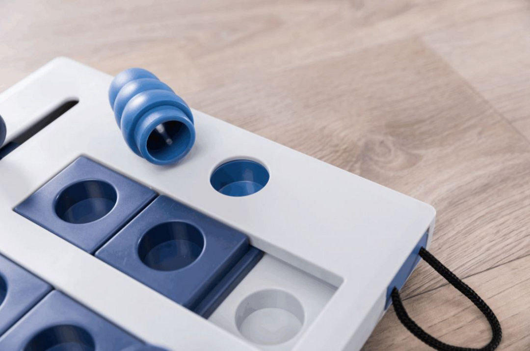 Bordspel voor gevorderde, kleine honden. Door de lades met behulp van lussen te openen en de kegel en schuif te bewegen komt de hond bij de beloning.