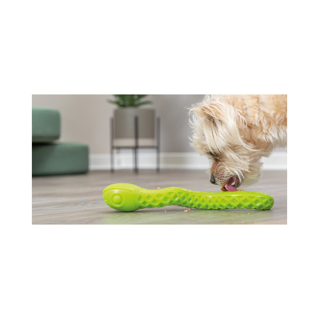 De TRIXIE Snackslang is een speeltje van thermoplastisch rubber (TPR) met een spleetvormige opening aan de onderkant. De slang kan gevuld worden met bijv. leverworst, snoepjes of koekjes.
