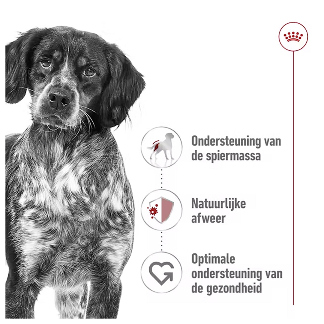 Deze voeding is geschikt voor middelgrote honden die tussen 11 en 25 kg wegen en ouder zijn dan 10 maanden. Deze formule is zorgvuldig samengesteld om de spiermassa te helpen behouden dankzij het hoge gehalte aan hoogwaardige eiwitten. Middelgrote honden hebben vaak een actieve levensstijl, waardoor ze kunnen worden blootgesteld aan verschillende omgevingsfactoren die hun immuunsysteem kunnen verzwakken. Om de natuurlijke afweer van je hond te ondersteunen is deze formule verrijkt met prebiotica en een strategische combinatie van vitaminen, waaronder vitamine C en E.
