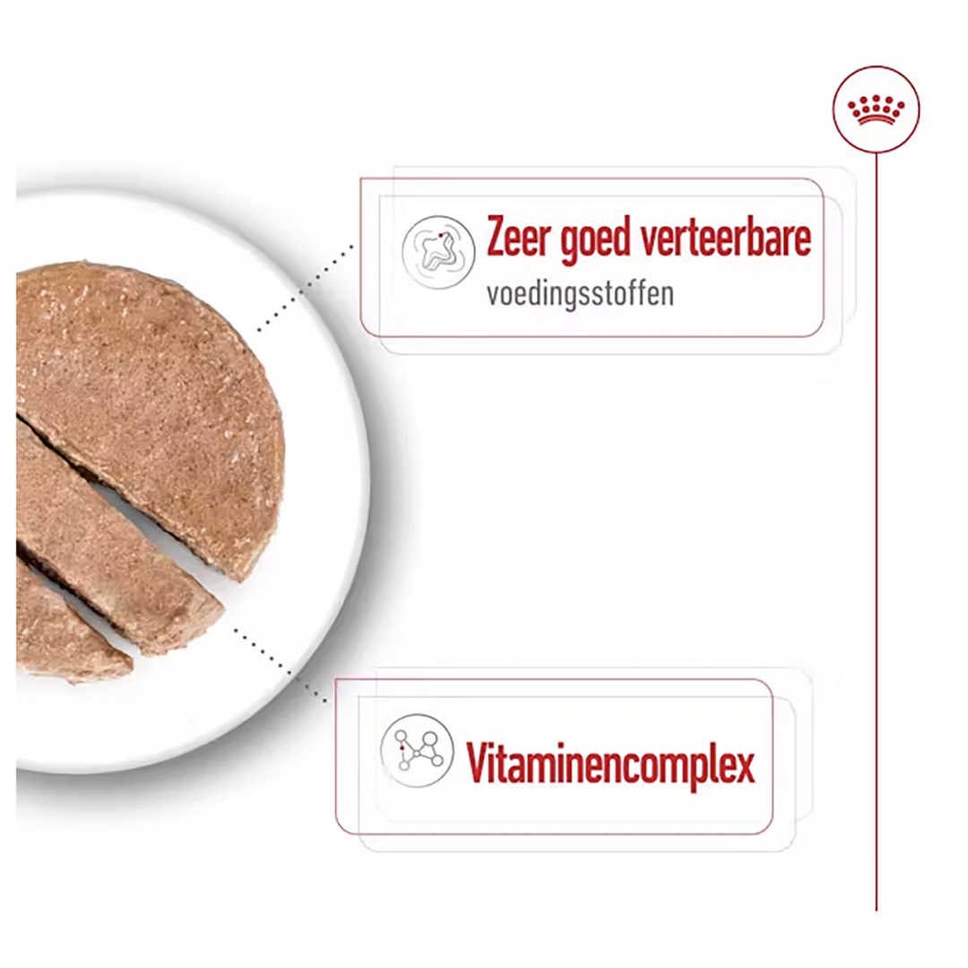 Royal Canin Mini Adult Loaf (paté) is een complete en uitgebalanceerde natvoeding die speciaal is ontwikkeld om te voldoen aan de specifieke behoeften van je grote hond en hem op volwassen leeftijd te ondersteunen.