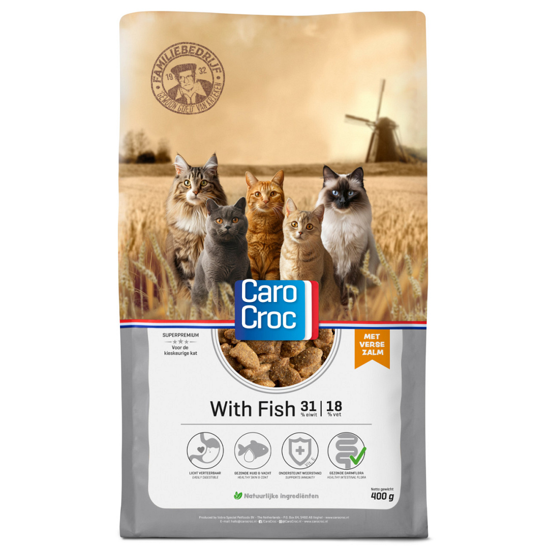 CaroCroc With Fish is een volledig dierenvoeder voor volwassen katten jonger dan 8 jaar. Licht verteerbaar en voor de kieskeurige eter. Katten zijn dol op vis! CaroCroc With Fish is bereid met verse zalm.