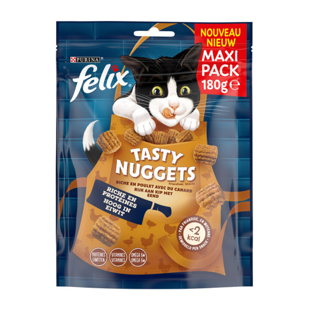 Felix Tasty Nuggets kip & eend is een verrukkelijke kattensnack met een hoog eiwitgehalte, gemaakt met een heerlijke combinatie van smaken om jouw kat een heerlijk moment te bezorgen, extra speciaal door de ruwe textuur, met gemiddeld minder dan 2 kcal per stuk en zonder kleurstoffen.