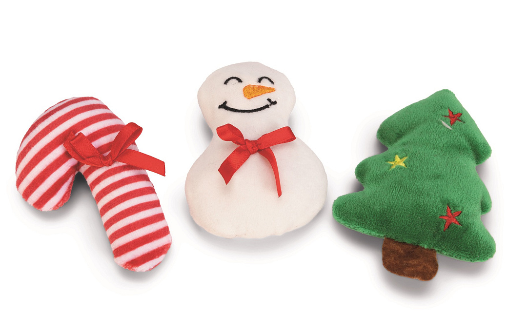 Kerstsok met drie verschillende pluchen kattenspeeltjes: een kerstboom, een zuurstok en een sneeuwpop.