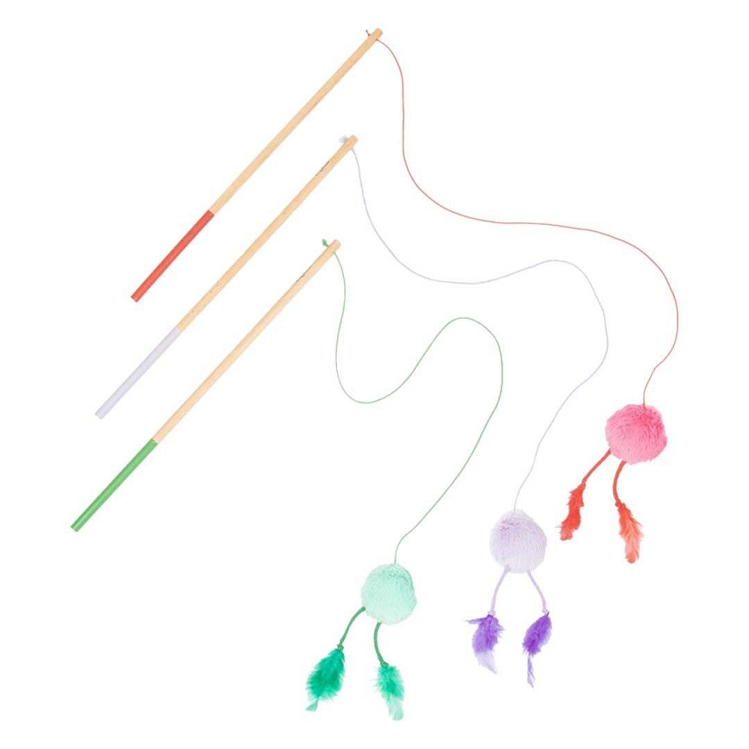 Houten kattenhengel met vrolijk balletje met veertjes. Kleur is niet vrij te kiezen