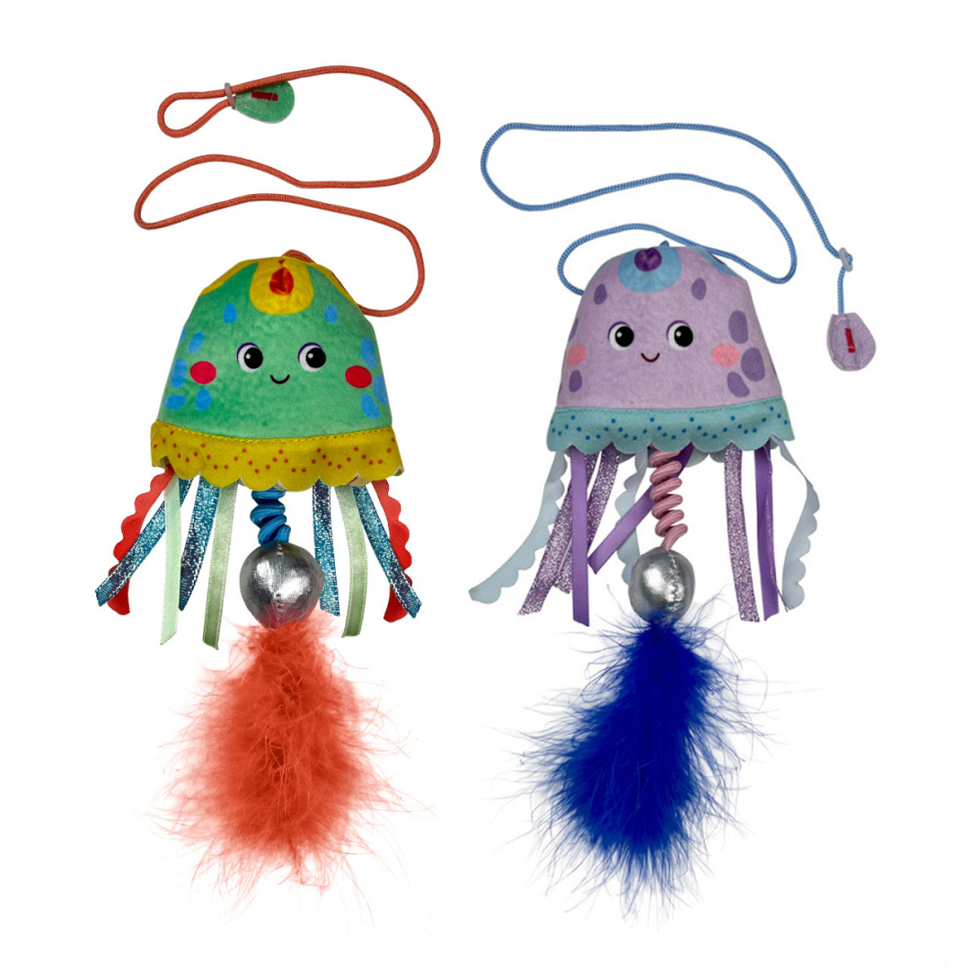 Laat je kat genieten van deze vrolijke springende Kong Teaser Jellyfish. Vanwege de toegevoegde bel en Kong premium Catnip, wordt het natuurlijke jachtintstint van jouw kat extra gestimuleert. De vrolijke kleuren en veren stimuleren het enthousiasme nog meer. Het touw wat je om je vinger kan doen, zorgt ervoor dat interactief spel ook mogelijk wordt gemaakt.