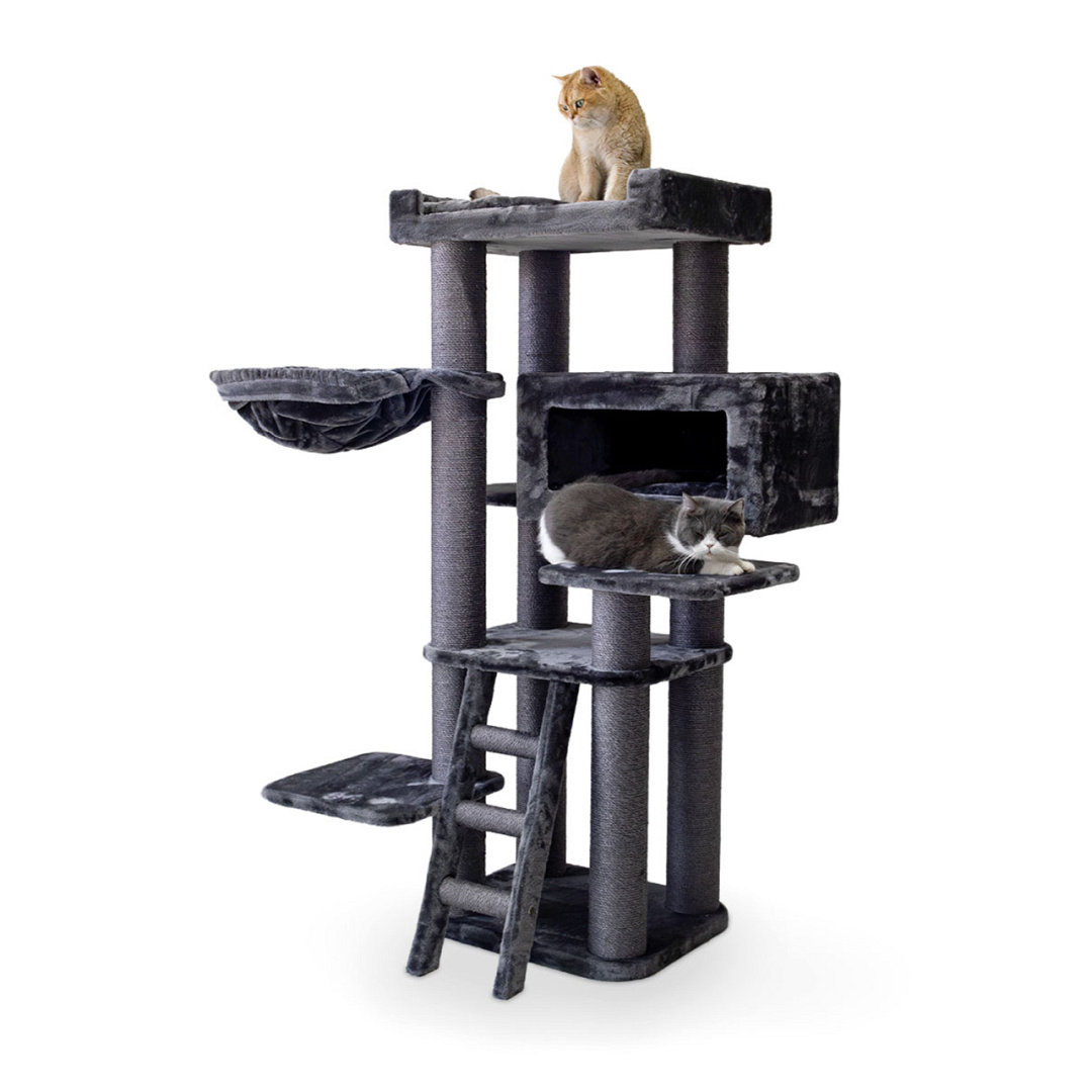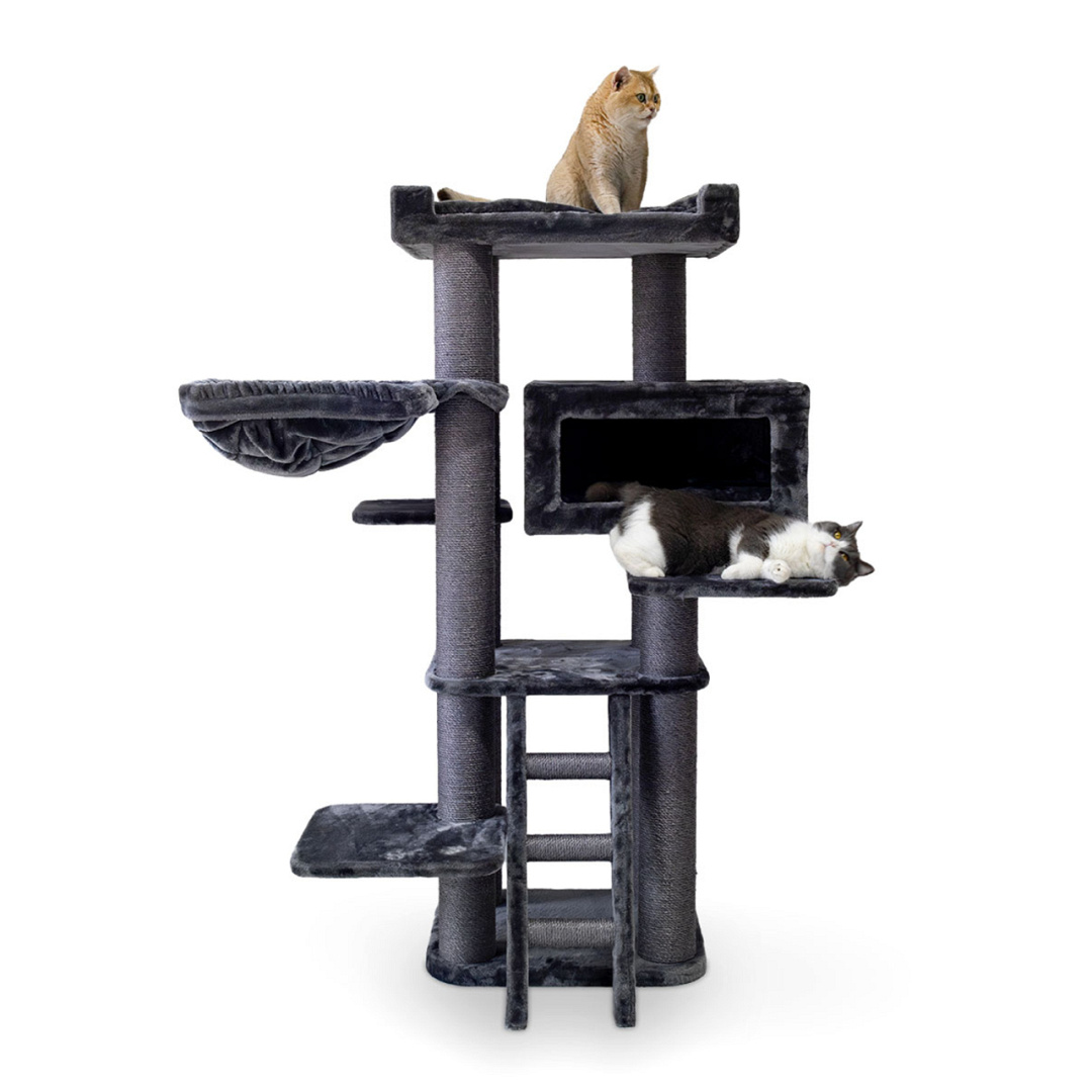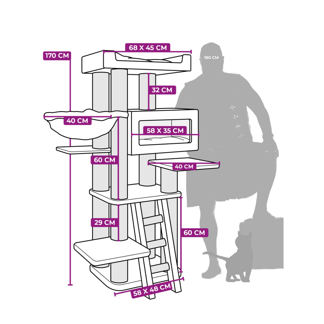Zeer groot krabmeubel met verschillende extra grote slaapplekken. Geschikt voor actieve, maar ook voor oudere katten. Afm. 80 x 62 x 170 cm.