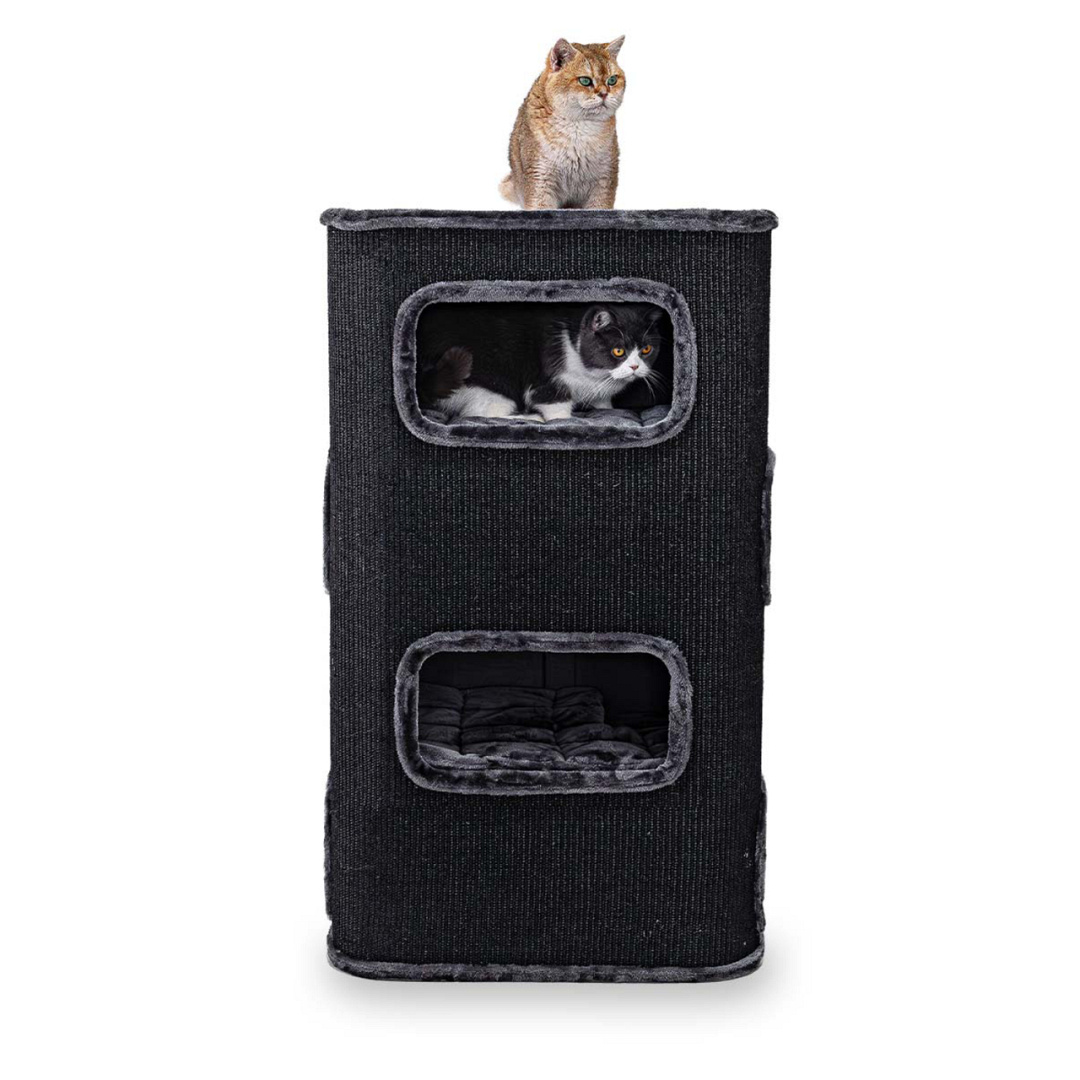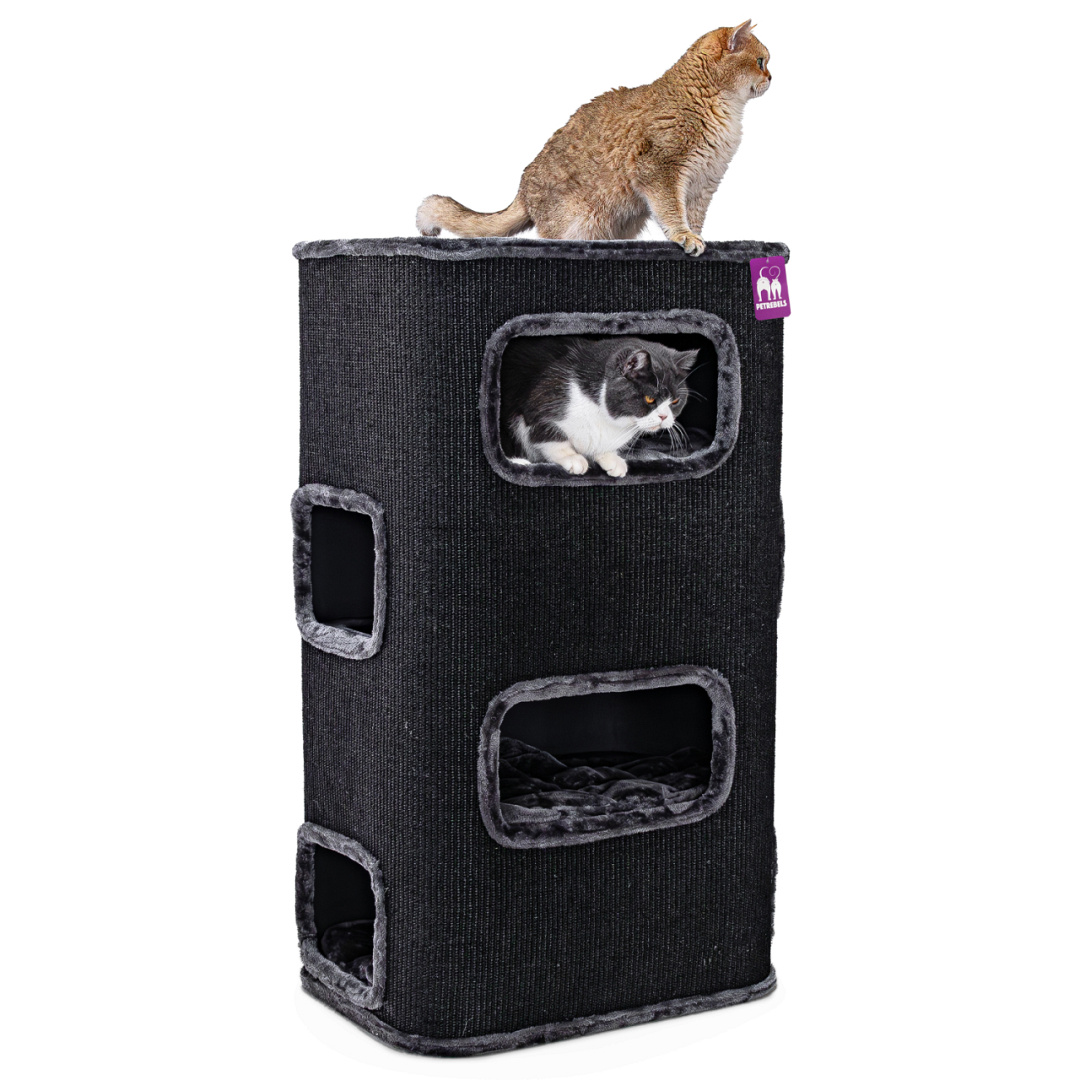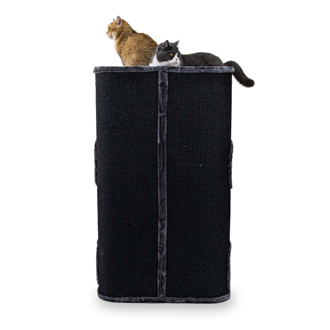 In deze Petrebels Champions Only krabton Vault 118 vind je geen goud of juwelen, maar iets veel en véél beters: ultiem gelukkige katten! De Vault 118 doet z’n naam eer aan, want deze krabtoren staat zo stevig als een kluis. En is voor niks anders ontworpen dan voor comfort. Bovenop kan je kat chillen op het zachte pluchen kussen en binnenin zijn vier royale slaapplekken waar je kat lekker kan snurken. De ingangen zijn slim verdeeld: twee aan de voorkant en twee aan de zijkant, net waar je kat zin in heeft. Ook fijn: de krabtoren is helemaal bekleed met extra sterke sisal en is dus ideaal voor katten die anders je meubels te grazen zouden nemen.