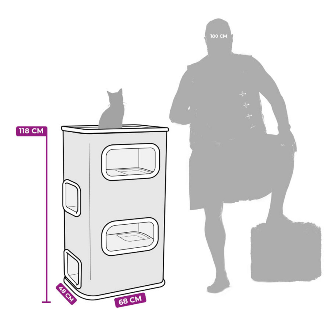 Stevige krabtoren met vijf royale slaapplekken. Rondom bekleed met extra sterk sisal. Afm. 68 x 48 x 118 cm.