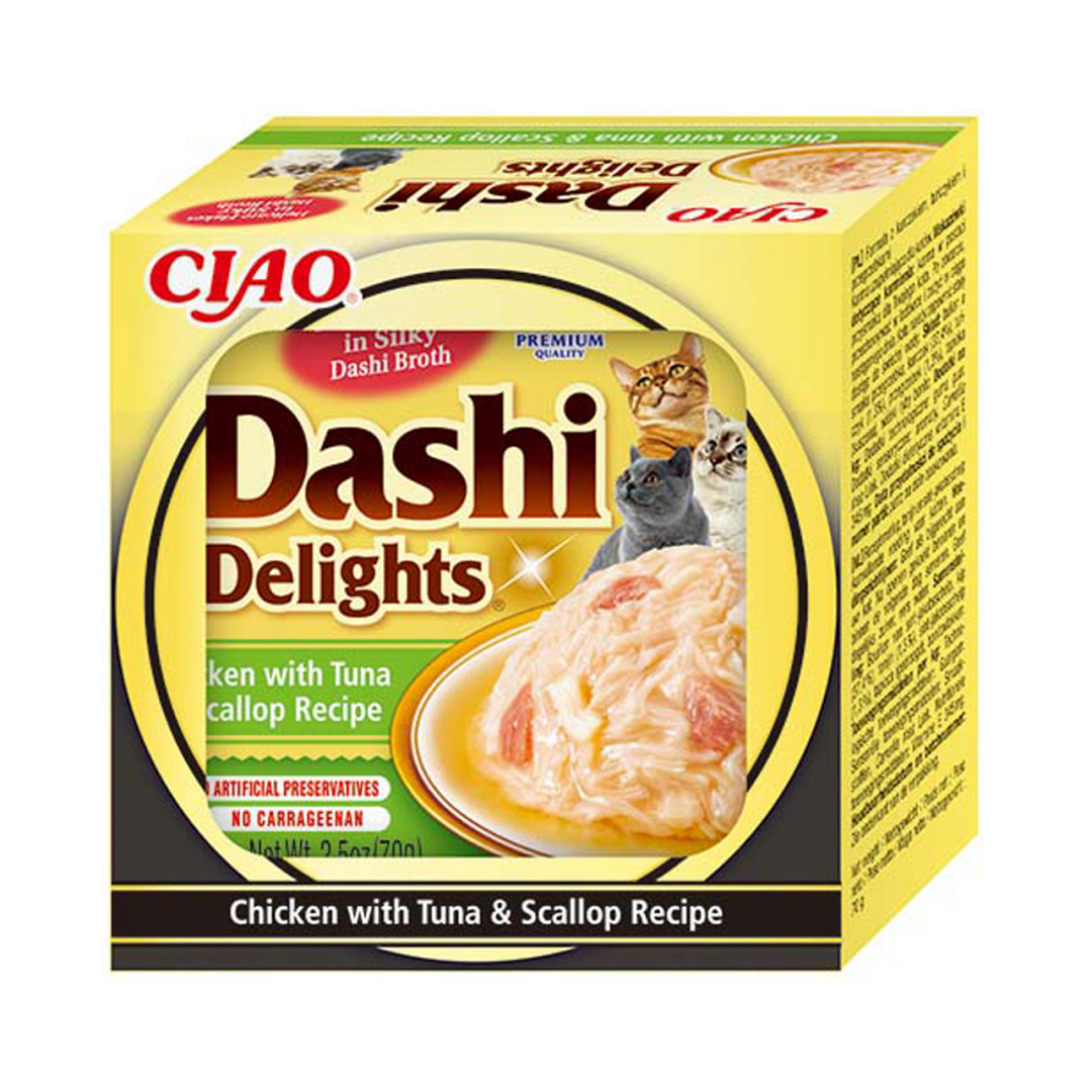 Dashi Delights is een aanvullend natvoer met versnipperde tonijnvlokken gekookt tot een bouillon boordevol Umami-smaak. Het stimuleert de eetlust, bevat veel vocht en bevat weinig caloriëen. Verpakt in een kuipje voor maximale versheid.