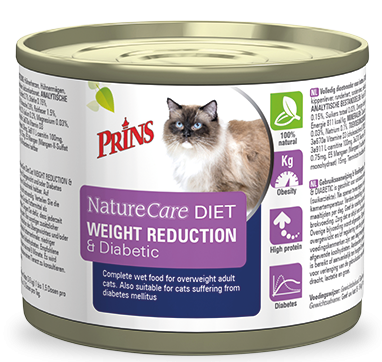 Prins NatureCare Diet Cat Weight Reduction & Diabetic is een natvoeding speciaal voor katten met overgewicht en/of diabetes. Deze speciale dieetvoeding is ontwikkeld in samenwerking met dierenartsen en is bedoeld om het gewicht van uw kat stabiel en gezond te krijgen en/of te behouden. Extra voedingsvezels helpen het hongergevoel te verminderen en ondersteunen uw kat tijdens het afvallen. Ook ondersteunt deze dieetvoeding een stabiele bloedsuikerspiegel, noodzakelijk voor katten met diabetes mellitus (suikerziekte).