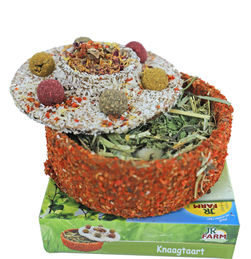 Verras jouw knaagdier met deze lekkere JR Farm knaagtaart! De taart is gevuld met heerlijke aromatische kruiden die je kunt aanbieden door de deksel te verwijderen. Deze is namelijk afneembaar. Met een omhulsel met vitaminerijke wortelen en knapperige kokosraspel en graanvrije bonbons en bloemen als versiering, zal jouw knaagdier dit taartje niet kunnen weerstaan.